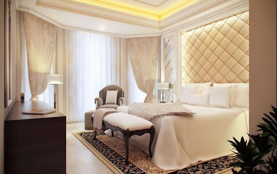 Классический стиль стремится создать уютную атмосферу за счет мягкого и гармоничного сочетания всей обстановки в спальне. Мебель часто выбирают в светлых или коричневых тонах. Для отделки используют нейтральный цвет — не белый, но и не слишком насыщенный. Также стены могут быть украшены декоративными плинтусами, лепниной.