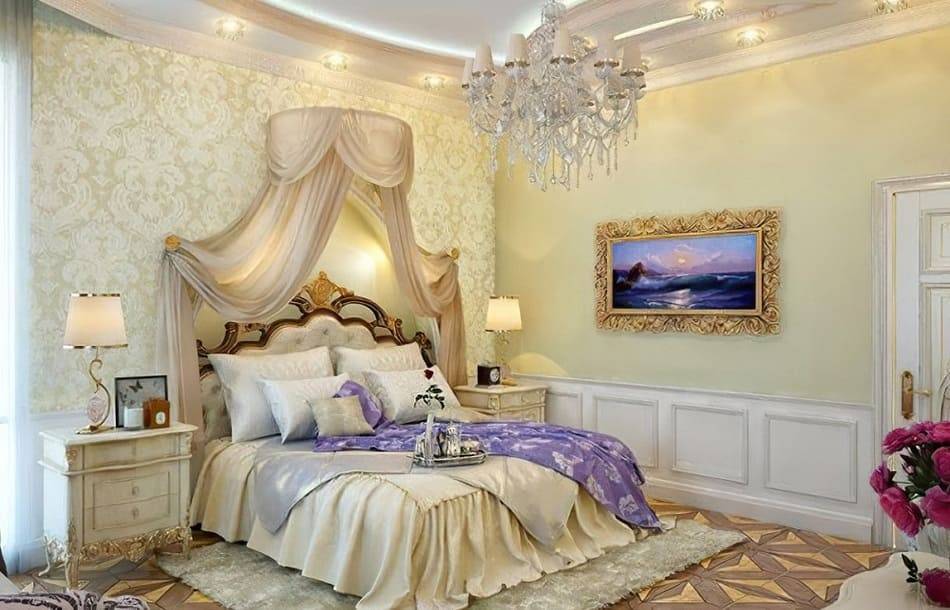 Плавные линии и дорогие текстуры – еще одно отличие этого стиля. В качестве аксессуаров выбирайте картины в стилизованных рамах, массивные люстры. Так как подобный дизайн может загромождать пространство, отдавайте предпочтение пастельным тонам.