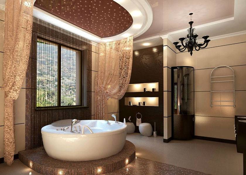Встроенная душевая кабина или ванна со стеклянной перегородкой, светлые сдержанные цвета (шампань, бежевый, белоснежный или серо-голубой) — в этом вся «классика». Не забудьте подчеркнуть классическую роскошь отделкой из натурального камня или мрамора и соответствующей сдержанной по дизайну мебели. Дополните классическую ванну элементами декора: шикарными светильниками, зеркалами в красивом обрамлении, элегантными полками для хранения.