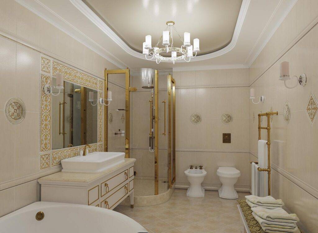 Классический стиль – прекрасное решение для больших помещений, где можно обустроить не только душевую кабинку, но и стильную ванну. Если стиль реализуется в небольшой ванной комнате, то нужно уменьшить количество декоративных предметов, сделав акцент на светлой цветовой гамме.