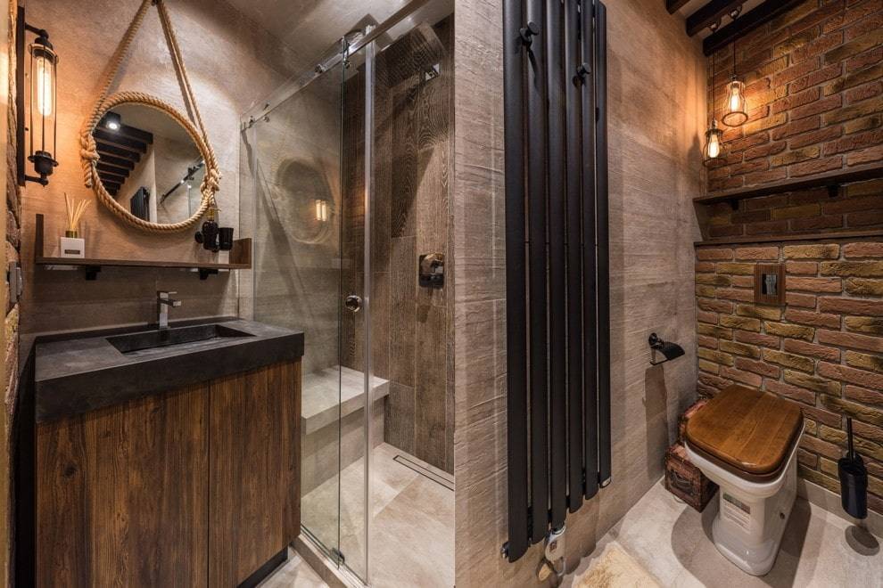 Стиль лофт — это сочетание самых нестандартных, но в то же время очень простых элементов — от металлических труб до дерева. Душевая кабина, выполненная из белого пластика, здесь будет смотреться инородным элементом. А вот поддон, встроенный в подиум, подойдет как нельзя лучше.
