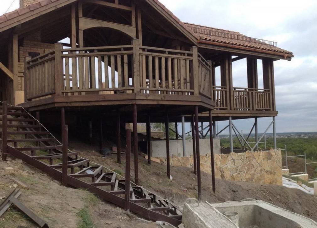 Свайный тип основания является самым распространенным видом, используемым при строительстве домов на участках с уклоном. Здесь для постройки используются подпорные колонны.