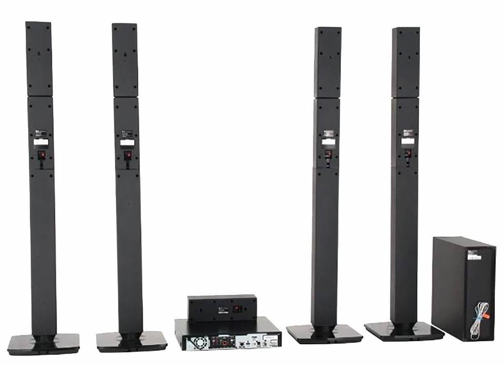 Отличительная особенность этой акустической системы 5.1 в том, что колонки скомбинированы попарно и выглядят, как два довольно крупных и небольших блока. В плане объемного звучания пользователи считают это решение очень удачным. За счет такого расположения домашний кинотеатр не займет много места и подойдет для средней и большой квартиры. За качество звука отвечают 2 встроенные фронтальные колонки по 130 Вт, 2 динамика и 1 тыльное устройство аналогичной мощности. Сабвуфер отлично передают низкие частоты, а плеер способен воспроизводить видео в формате FullHD, в том числе и с эффектом 3D.