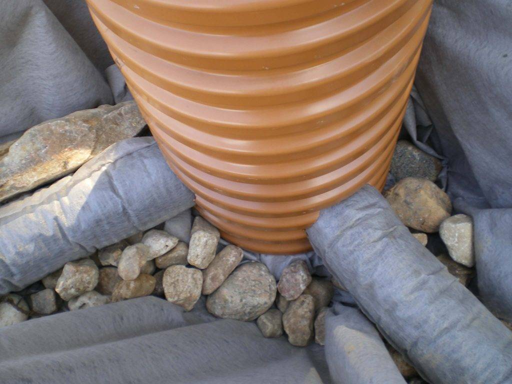 Трубный дренаж отводит воду к водосборному колодцу. Водоотводящие дрены укладываются в траншеях. Перфорированные трубы засыпаются щебнем и закрываются геотекстилем. Соединяясь с коллектором, вода выводится к сборочному колодцу.
