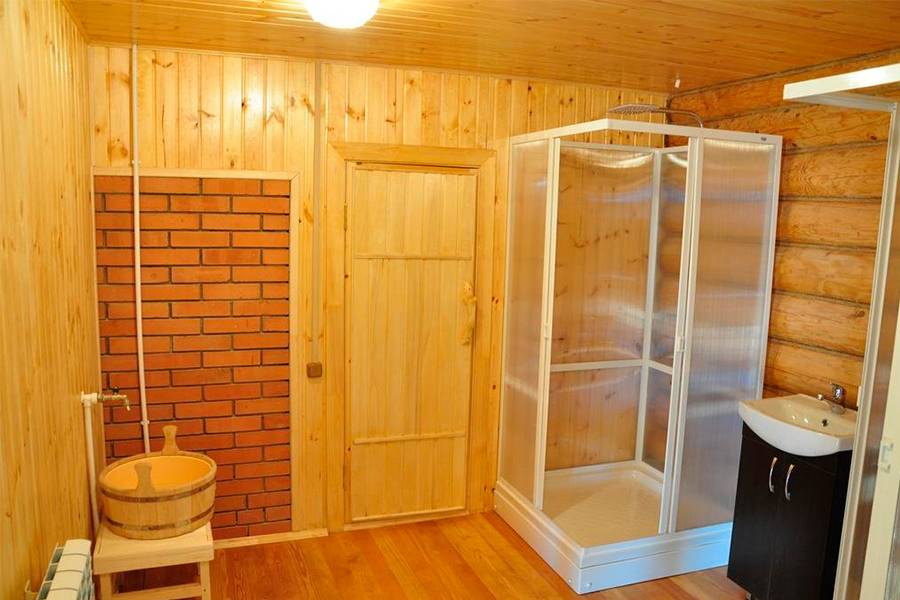 Если баня возведена из сруба, то тут же встает вопрос об ее внутренней отделке. При грамотно обшитых стенах водостойким гипсокартоном, душевую можно обложить керамической плиткой или же отделать помещение вагонкой.