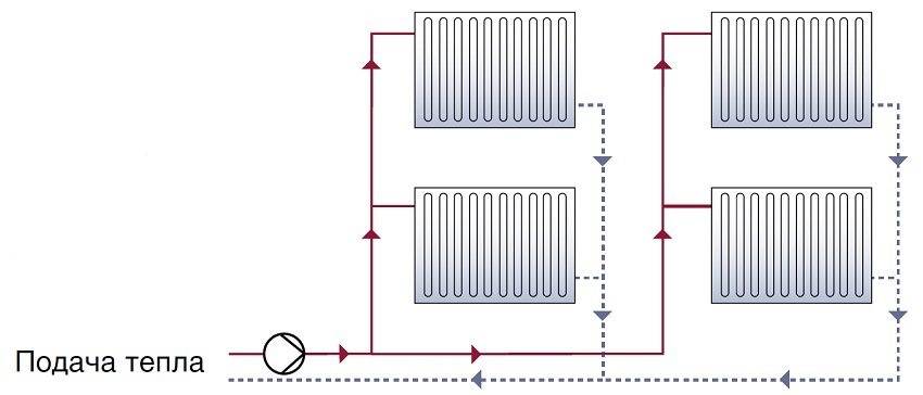 Параллельное подсоединение батарей в 2-трубной схеме с расширительным закрытым резервуаром