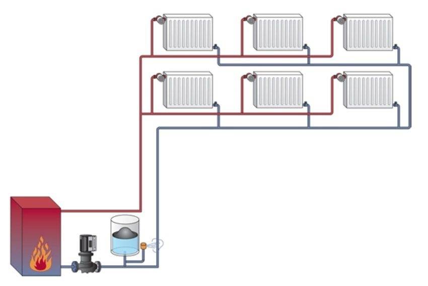 Схема двухтрубной системы отопления с принудительной циркуляцией и теплыми полами