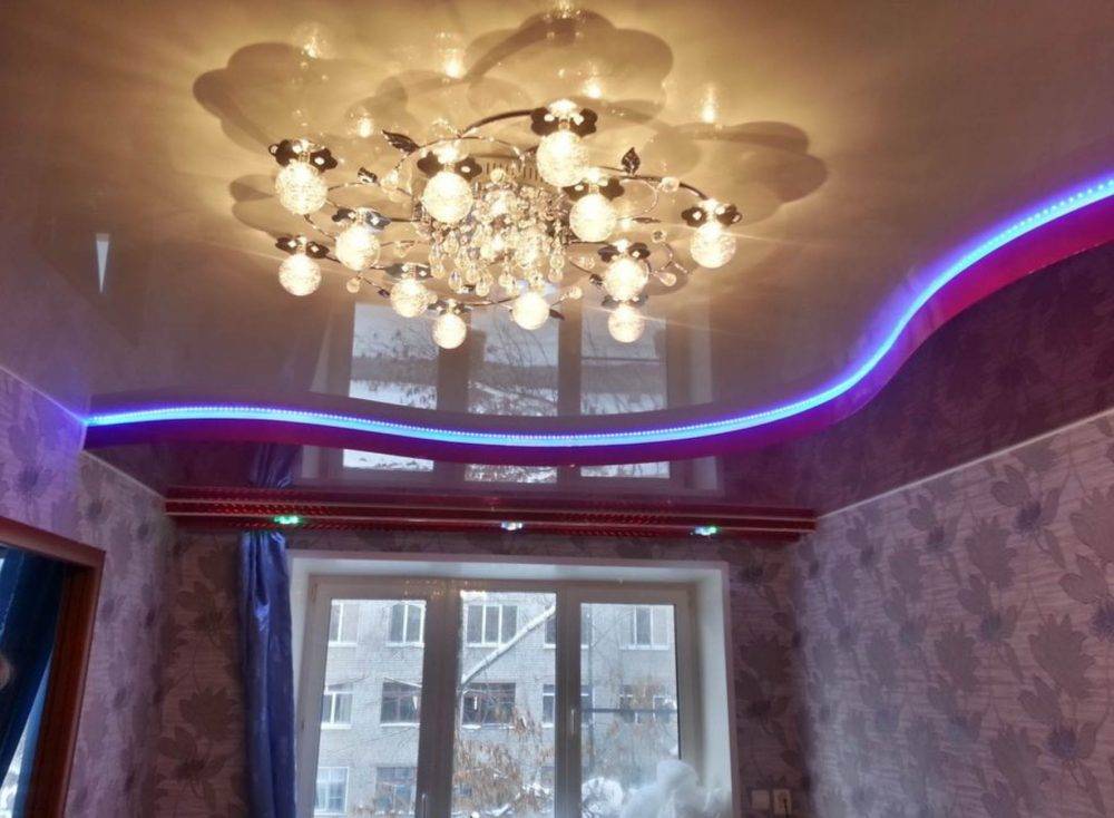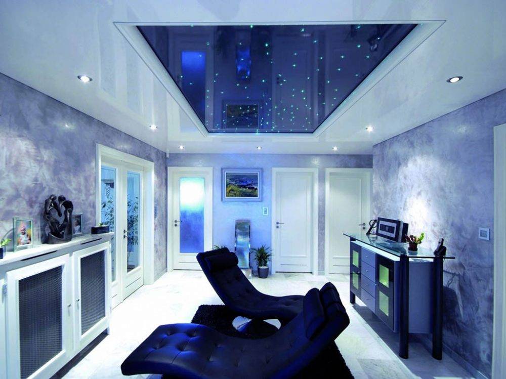 Световое оформление. Используя натяжные потолки, также открывается больше возможностей для создания уникального освещения. Подсветить потолок можно изнутри, создавая таким образом потрясающий эффект. Ярким примером является очень популярное оформление в виде звездного неба, но вариаций, на самом деле, великое множество;