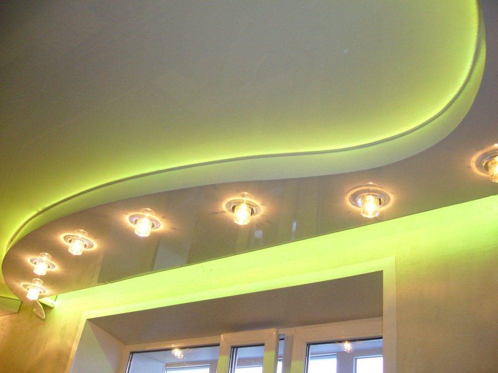 Световые решения с зеленой, оранжевой, желтой, белой или красной подсветкой, делают потолочную конструкцию более изысканной.