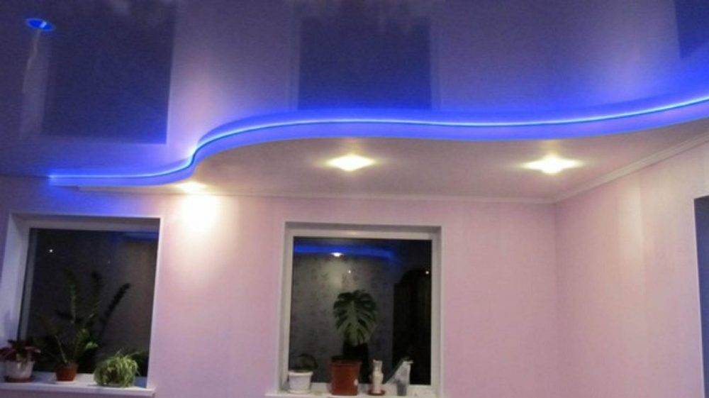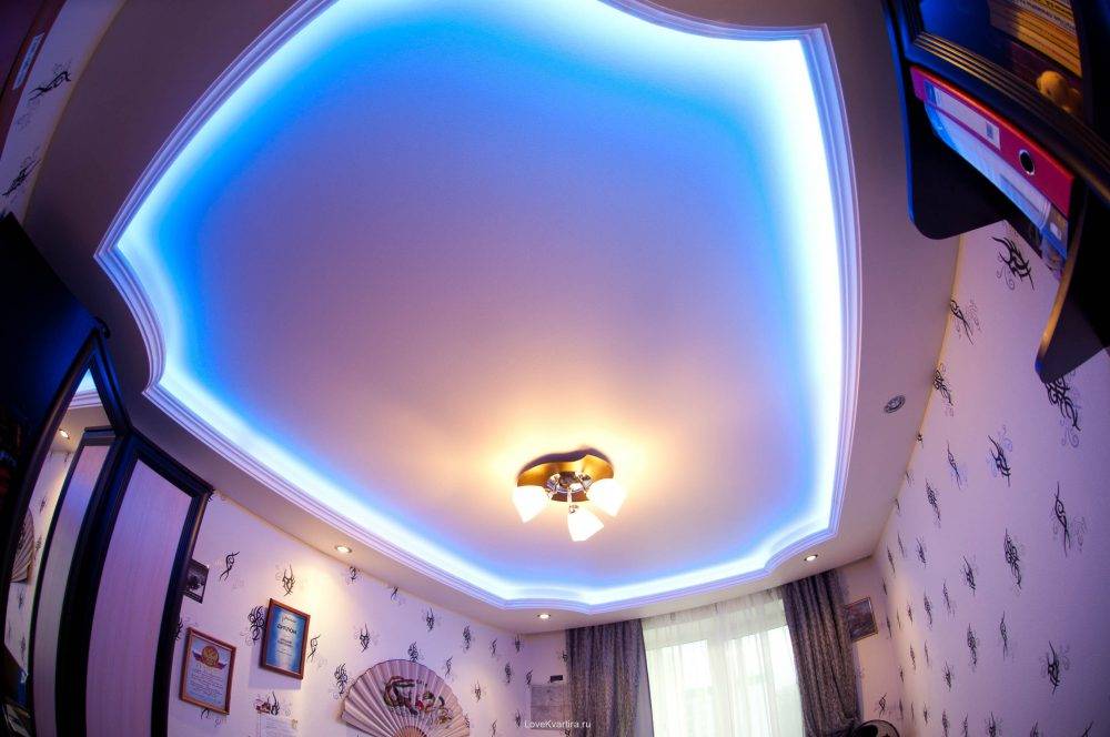 Выглядит оригинально, красиво и очень эстетично. Ниша с синей, фиолетовой или бирюзовой подсветкой придает потолочному пространству особой таинственности.