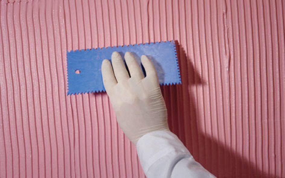 | Наносим подготовленный состав на стену с помощью шпателя и равномерно распределяем по поверхности. | |