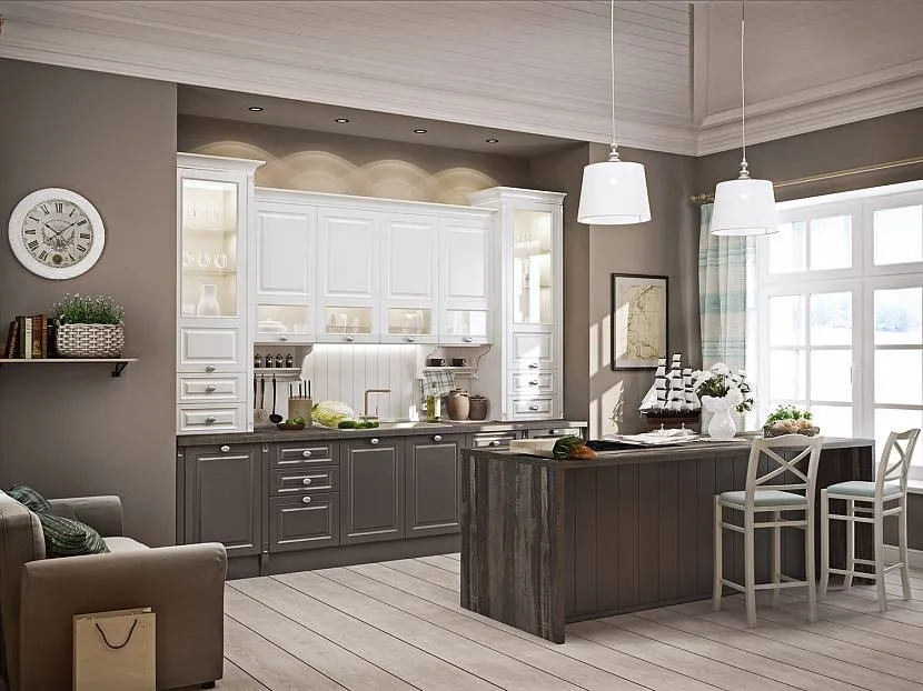 Сочетание белого и серого цвета в кухонном гарнитуреИсточник lorena-kuhni.ru