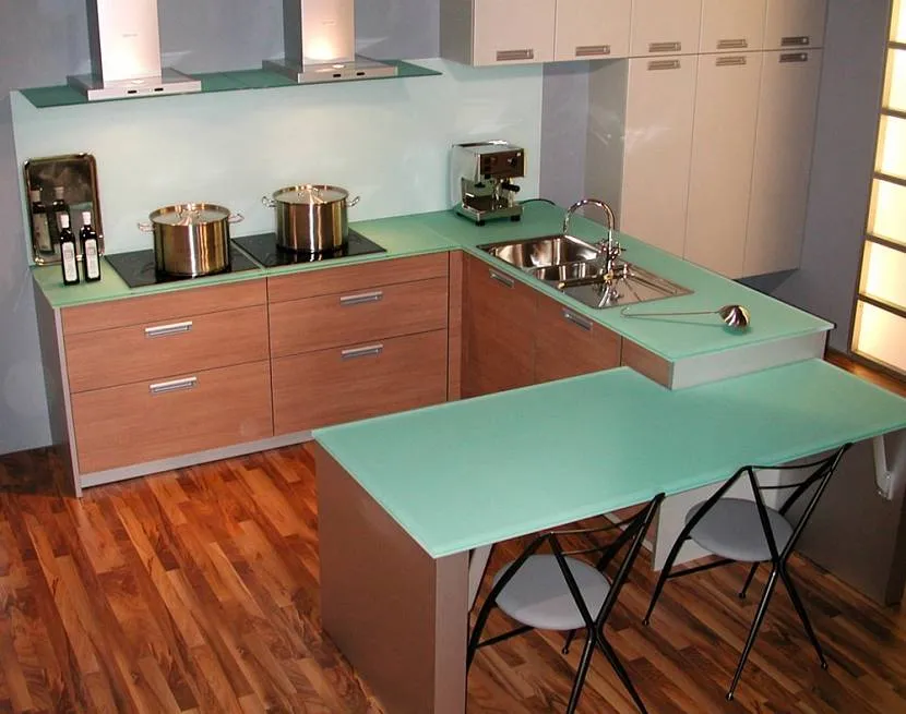 Столешницы, созданные только из закаленного стекла, встречаются довольно редко. Однако популярен прием добавления стеклянных вставок на каменную или деревянную столешницу. Подобная мебель смотрится эффектно и стильно.
