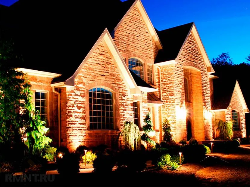 - Используют прожекторы с направленным потоком и отражателем, распределяющим свет равномерно на всю высоту коттеджа или другого строения. Их мощность зависит от освещаемой площади.