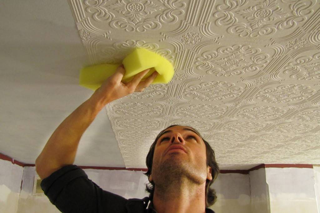 Насколько бы плотной ни была структура обоев, предварительные работы – неотъемлемый этап. Потолок следует выровнять, ошкурить строительной сеткой или обычной мелкозернистой наждачной бумагой, а затем обязательно загрунтовать.