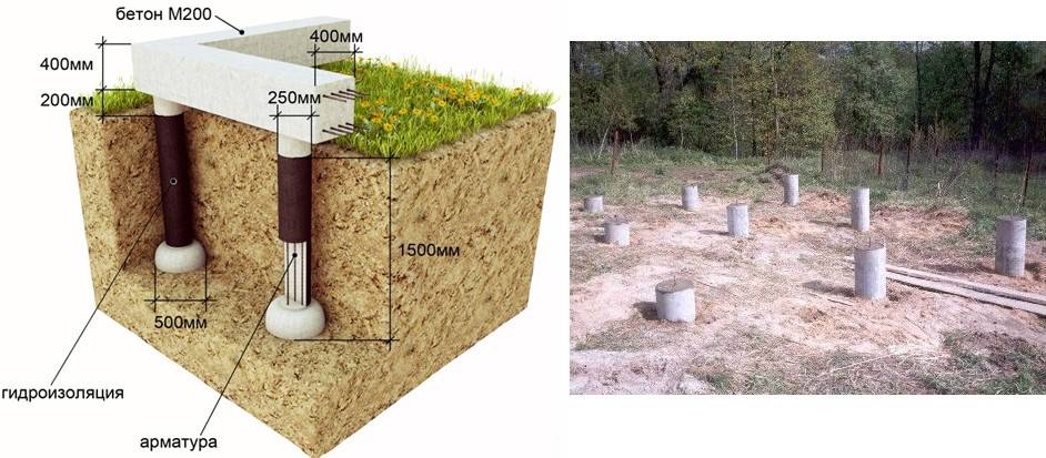 В случае с бетонными опорами под древесину ростверка укладывают слой гидроизоляции в виде рубероида, бикроста или полиэтиленовой пленки.
