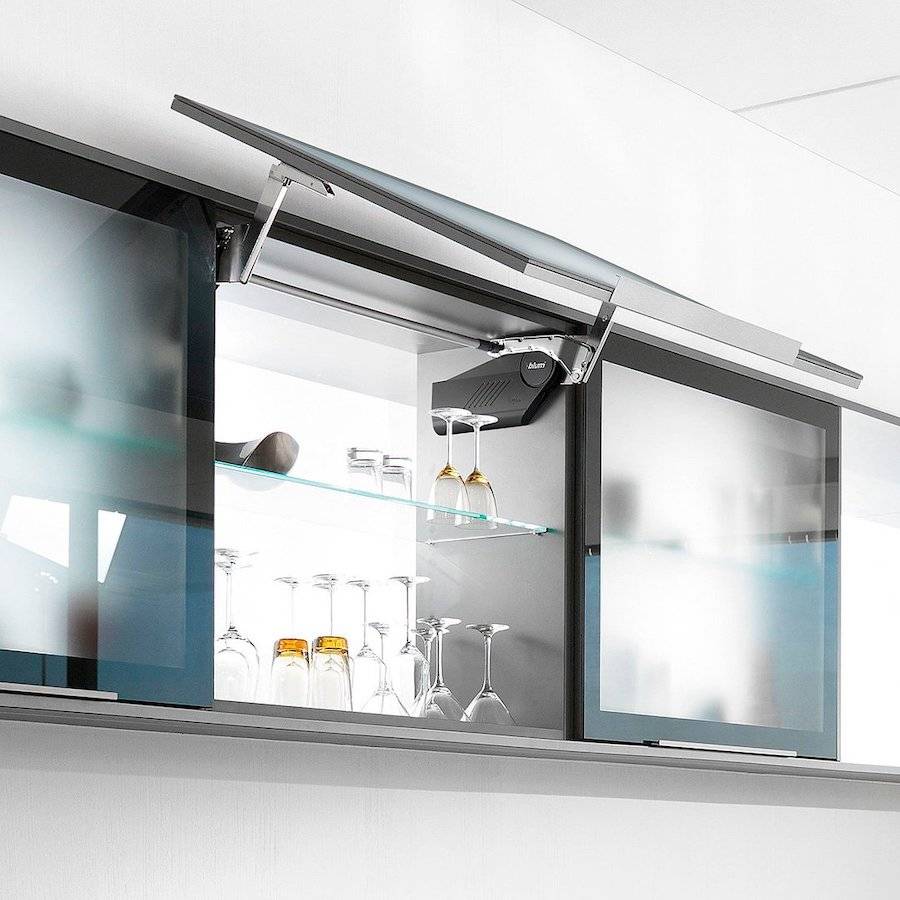 Фурнитура Blum в лице подъемных механизмов AVENTOS, делает открытие/закрытие дверок максимально удобно и предельно безопасно, если сравнивать с классическими петлями на четырех шарнирах.