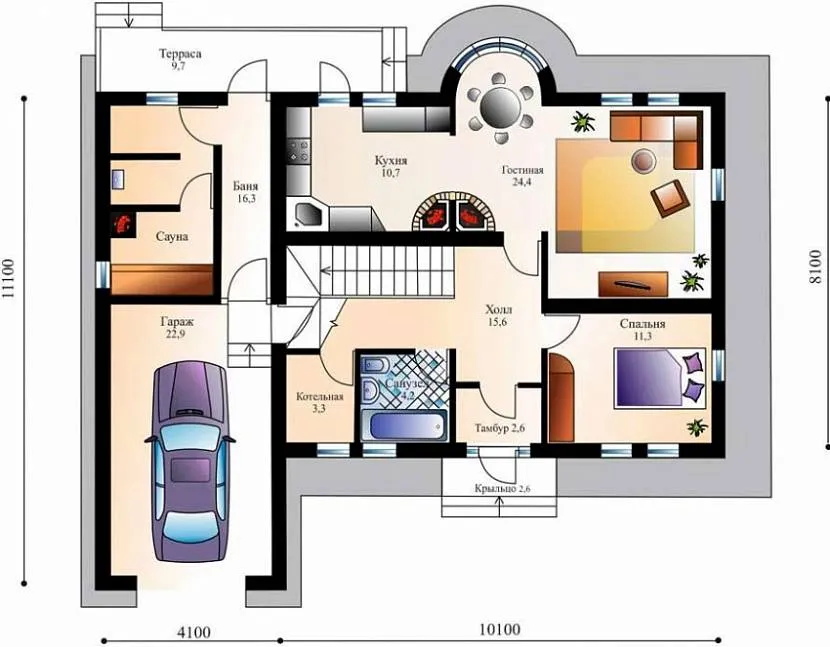 Если цокольный этаж занимает всю площадь здания или большую ее часть, кроме гаражного бокса там удобно разместить сауну, комнату отдыха, котельную, подсобные помещения.