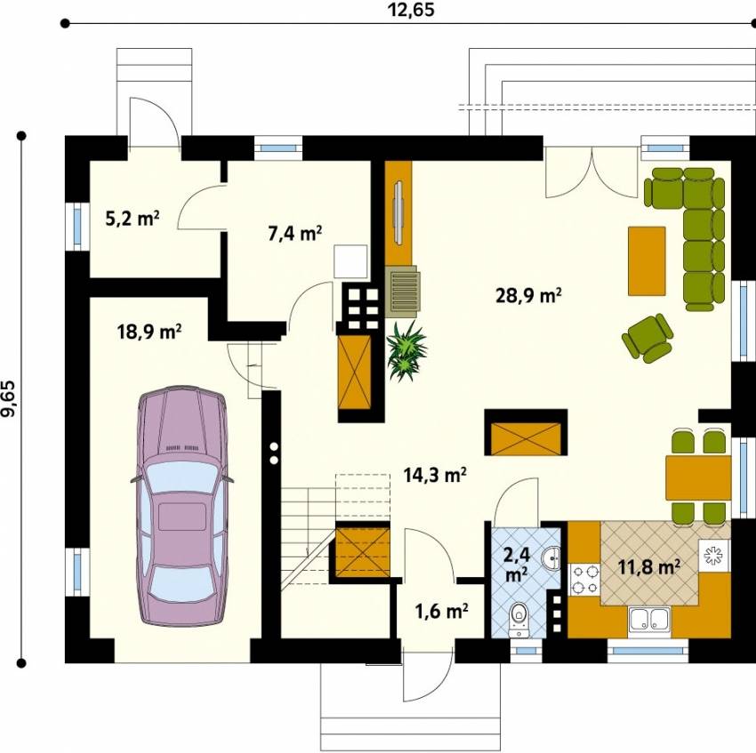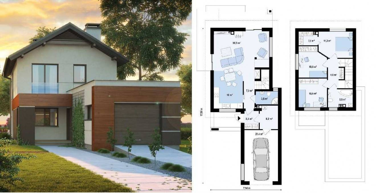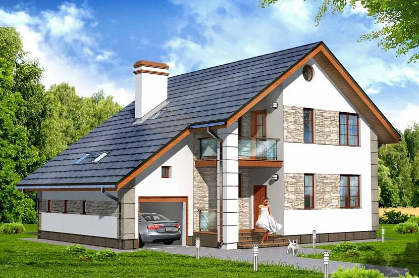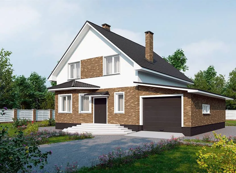 Такой дом со встроенным автогаражом подходит для постоянного проживания и, благодаря простой форме, легко размещается на участке.