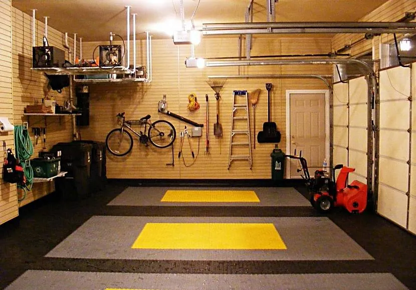 Другой вариант — когда из гаража проектируют выход во внутренний двор, где хранят крупногабаритные вещи — например, велосипеды, тележки и другой садовый инвентарь. Если таких вещей много, лучше оборудовать гараж дополнительными полками.