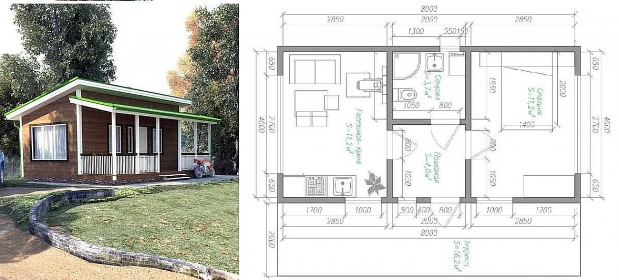 Если бюджет строительства сильно ограничен, рассмотреть проекты дачных домов с односкатной крышей. Они непривычны для нашей станы, но стоимость кровли при небольшой площади намного меньше. Только надо выбрать правильный угол уклона кровли (с учетом величины снежного покрова).