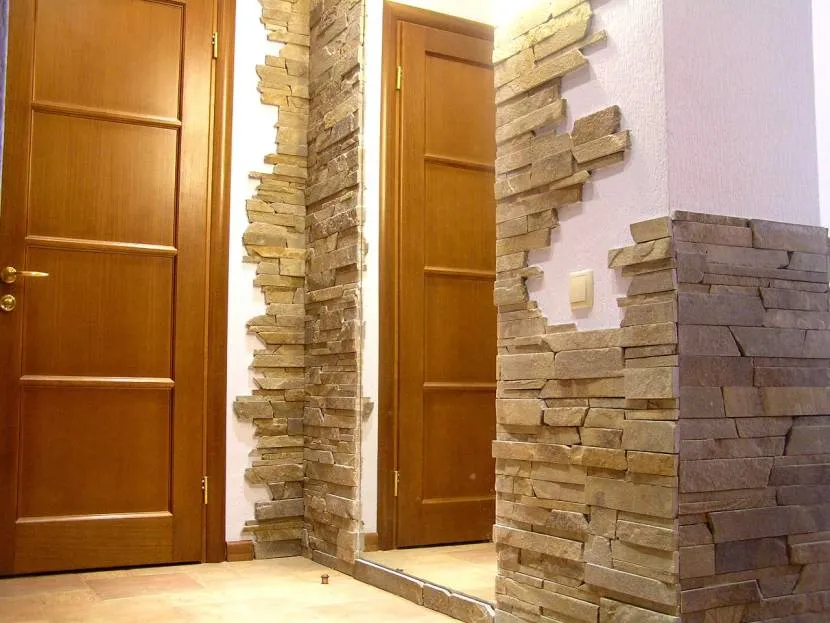 Укладка камня фрагментами используется, когда нужно выделить лишь отдельные предметы. Очень неплохо смотрится дверной проем, обрамленный камнем, имитирующим кирпичную кладку. Также, таким способом выделяют предметы мебели в коридоре. Это может быть тумба, вешалка, обувная полка или платяной шкаф.