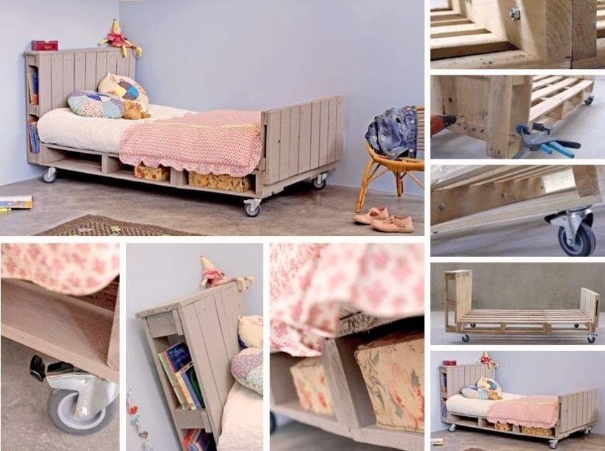 Для изготовления детской передвижной кровати понадобится несколько паллет и ролики