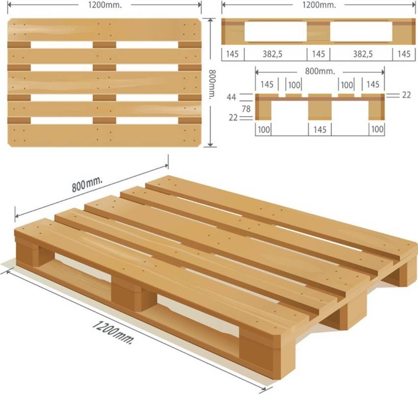Стандартные габариты паллета согласно ГОСТу составляют 120х80х14.4 см. Но для ручного создания это не так принципиально, они могут отходить в большую или меньшую сторону. Главное, чтобы вся конструкция была ровной, не было выступающих досок.