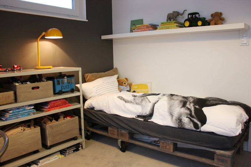 Поддоны могут использоваться для создания мебели в детских комнатах. Однако в этом случае придется тщательнее подходить к выбору строительного материала. Кровать, изготовленная из поддонов, станет отличным решением, если хочется организовать спальное место для ребенка на даче. Для работы потребуется 3 паллеты, одна из них будет разобрана на детали.