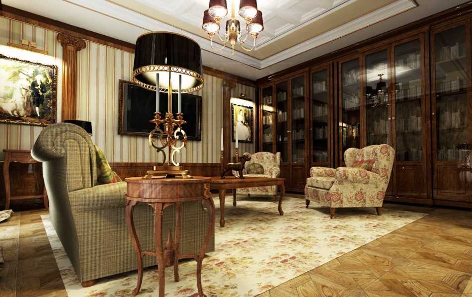 Лепниной или балкой оформляется потолок. Роль зала для приёмов играет английская гостиная. Её следует украсить дубовыми панелями, портретами, оружием, кирпичным или каменным камином.