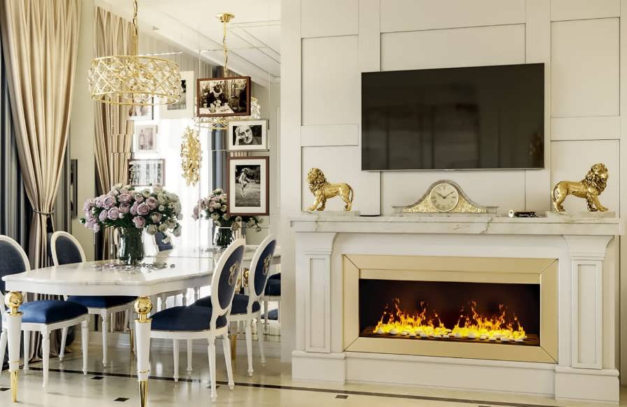 Классический – нарядный, торжественный, симметричный очаг, который может быть обрамлен колоннами и вензелями, встроенным порталом. Украшают традиционные камины фотографиями, и дизайн гостиной с кухней в загородном доме становится более уютным, оставаясь аристократическим и элегантным.