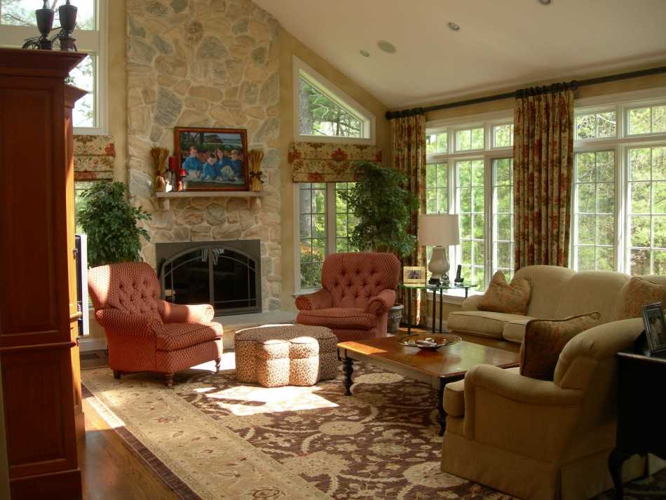 Отлично подойдет стиль английского кантри: натуральность, простота, практичность. Теплая цветовая гамма. Этот стиль отлично сочетает в себе камин и различные гобелены.