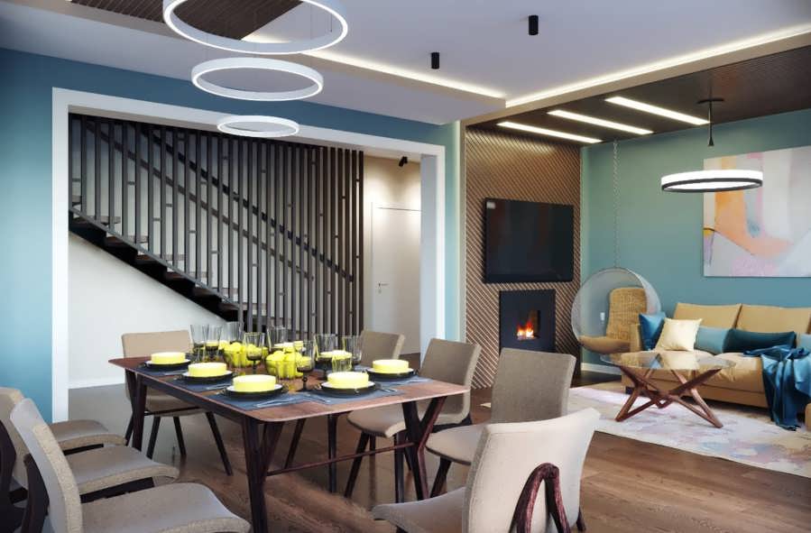Как и в любом доме, в интерьере гостиной очень важно верно расположить мебель отталкиваясь от предназначения комнаты. Если гостиная совмещена со столовой зоной, то следует разделить помещение на следующие зоны: