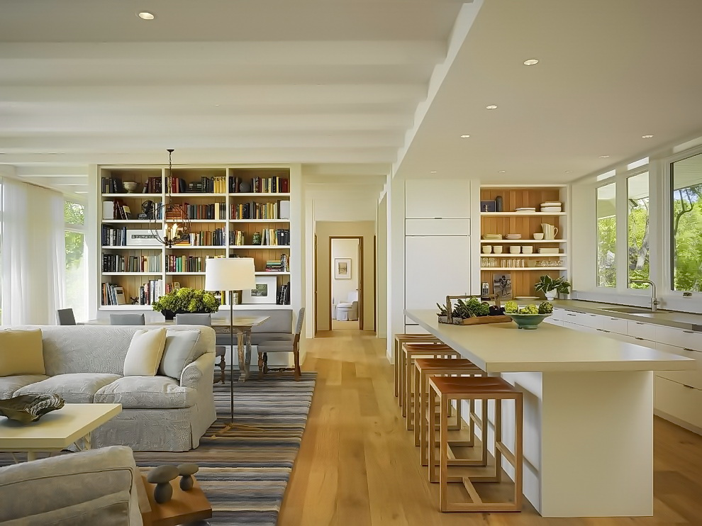 При этом вовсе не нужно на кухне и в зале клеить схожие обои или устанавливать одинаковое напольное покрытие. Такие зоны могут иметь разное декоративное оформление, но при этом они должны идеально сочетаться между собой.