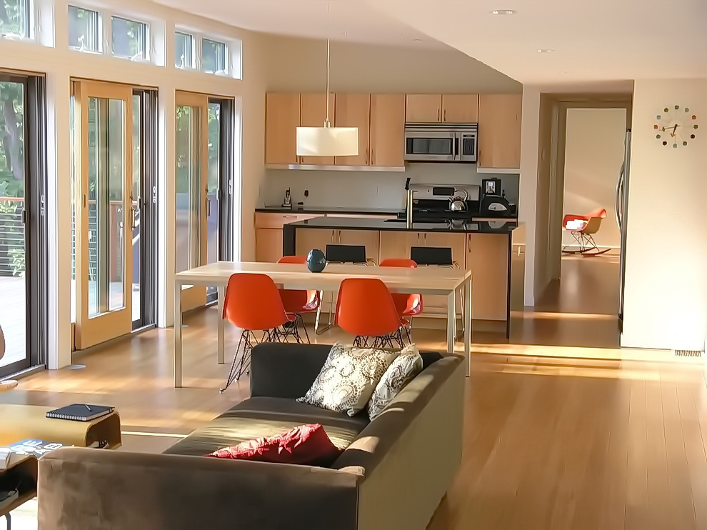 Мебель. Зонировать можно при помощи мебели, устанавливая ее на границе зон. Если поставить обеденный стол со стульями между кухней и гостиной, получится гармоничное пространство с зонами, плавно перетекающими друг в друга. Кухню удобно отделять барной стойкой, которая сама по себе является многофункциональным предметом с большими дизайнерскими возможностями. Гостиную часто отделяют большим диваном; для этого его разворачивают спиной к рабочей зоне.