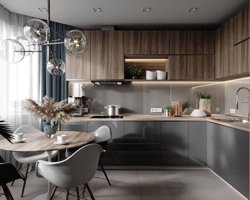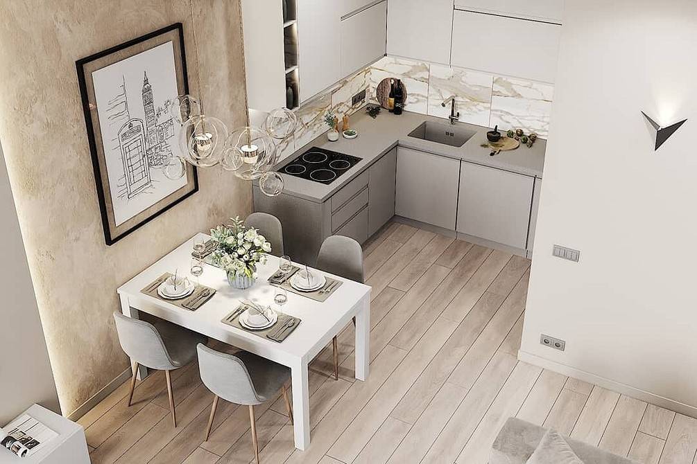 Строгий стиль дизайна для небольшой кухни-гостиной
