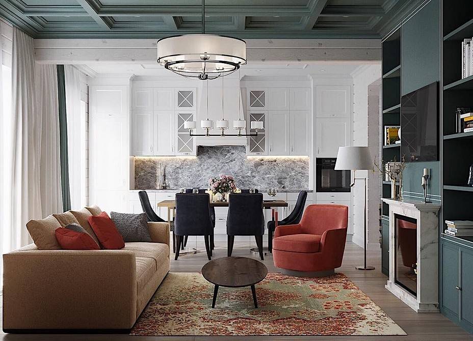 В таком помещении много роскоши и позолоты. Оформляется кухня-гостиная в нежных пастельных тонах. Стены бывают идеально отштукатурены или покрыты дорогими обоями с минимум узоров. Для потолков уместна лепнина. Причем в зоне гостиной расположена шикарная люстра, а кухню венчают уникальные светильники. На границе двух зон оформляют колонны из дорогих материалов или ажурные деревянные арки. Мебель выбирается из натурального массива, а дорогая обивка диванов и кресел располагает к отдыху, вторя богатому оформлению окон. В кухне дорогая современная техника соседствует с известными марками посуды.