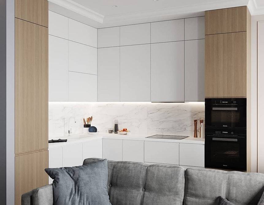 Второй случай станет вариантом для тех людей, кто предпочитает питаться вне дома и не проявляет интереса к готовке в домашних условиях. Стилистически кухня становится продолжением зоны отдыха. Подбор кухонного гарнитура производится в тон с общим оформлением студии, бытовая техника встраивается в шкафы, напольные материалы используются одинаковые для кухни-гостиной.