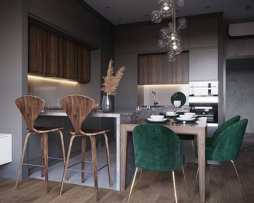 При этом, барная стойка может служить как самостоятельной обеденной зоной (для небольшой семьи), так и дополнительным местом для быстрых перекусов. Если место в кухне-гостиной или студии позволяет, то лучше установить и отдельную полноценную обеденную группу, например, для приема гостей.