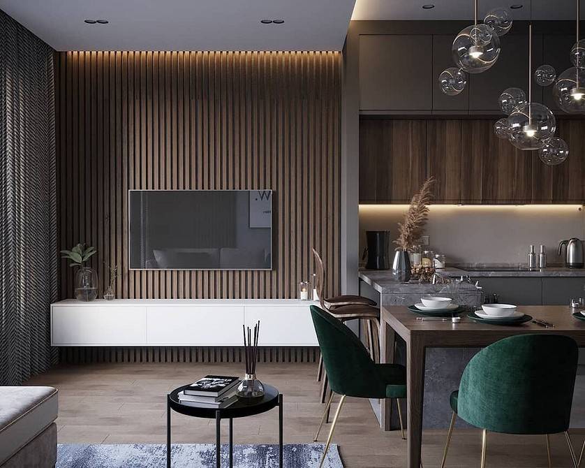 - Телевизор желательно разместить в видимой части как с кухни, так и из гостиной. Оптимальным будет разместить ТВ лицом к дивану для удобного просмотра передач.