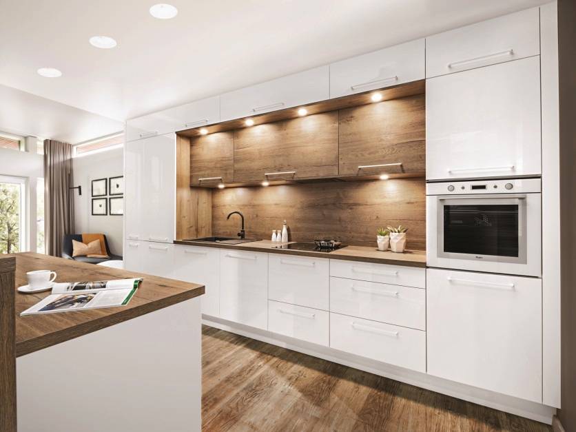 - В рабочей зоне лучше прикрепить светильники под навесные шкафы для удобства при приготовлении.