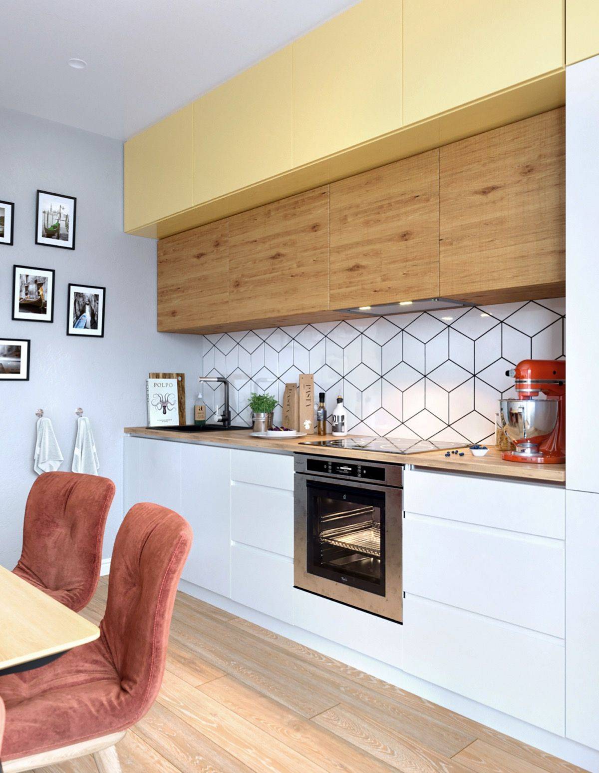 | Рис. 23. Антресоли в контрастном желтом цвете, фартук из плитки, а нижние шкафы, как обычно, древесного декора |