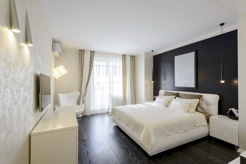 Если в спальне потолок выполнен в белом цвете, таким же может быть и пол. Белоснежный при этом можно сочетать с темными тонами. Такой цветовой ансамбль смотрится невероятно привлекательно и придает помещению особый шарм.