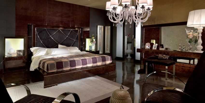 Кровать в ней обычно является центральным элементом помещения, по бокам которой располагают прикроватные тумбочки, у изножья – оттоманку. Ближе к окну часто ставят туалетный столик и кресло для чтения. Также в спальне размещают шкаф для одежды или полноценную гардеробную для вещей.