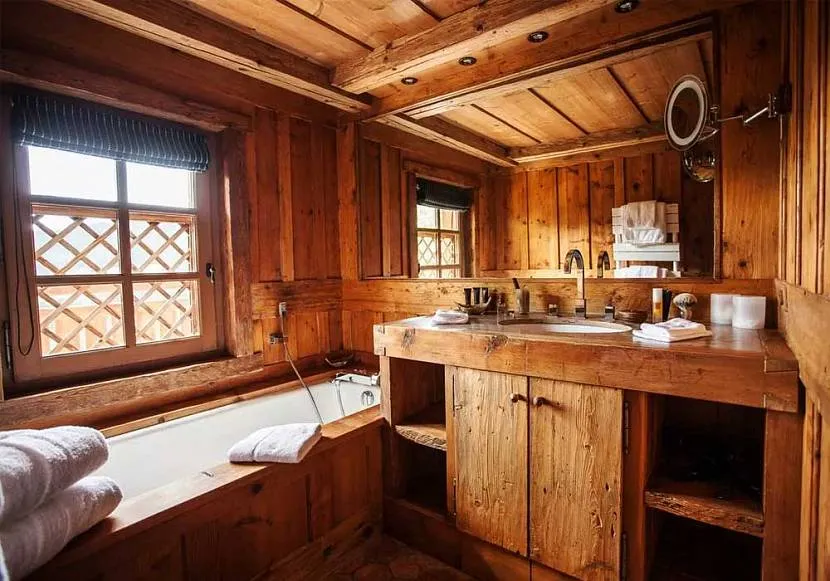 Это наиболее известный дизайн ванной в частном доме. В этом варианте оформление стенок, пола и потолка выполняется древесиной. Если есть окошки, то их драпируют шторками в клеточку. Внешний дизайн помещения выгодно подчеркивается шахматными полотенцами, бархатными халатиками и прочими “девайсами”. Подходящими в данном стиле станут древесные стеллажи и пушистый ковер черного тона.
