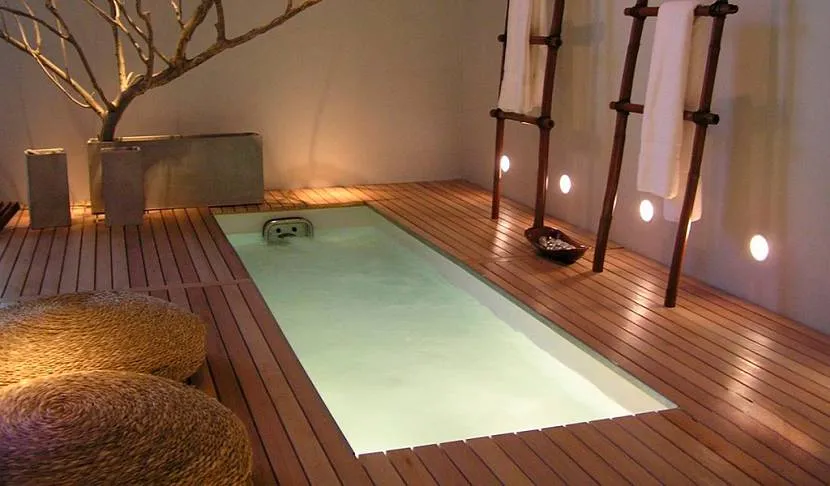 Встроенная в пол ванная смотрится очень оригинально, такая композиция однозначно выделит комнату и наполнит ее японскими нотками умиротворенияИсточник inhomes.ru