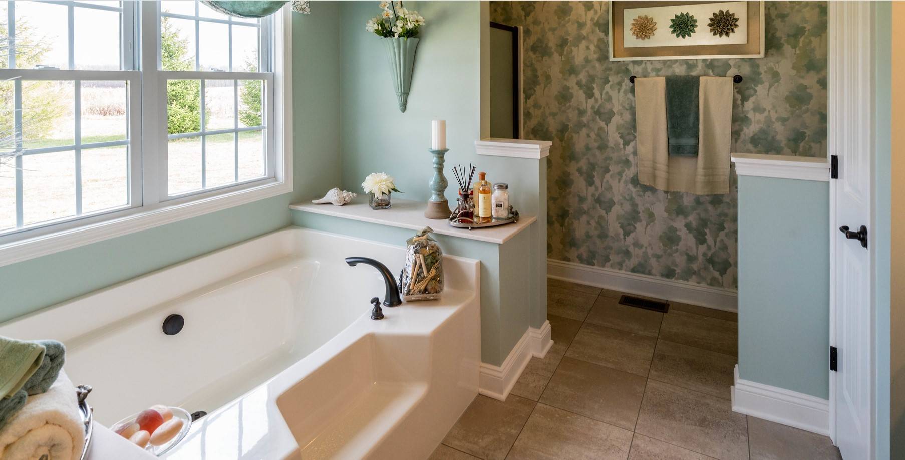 Покрытие нежных оттенков в ванной комнате, выдержанной в деревенском стиле.