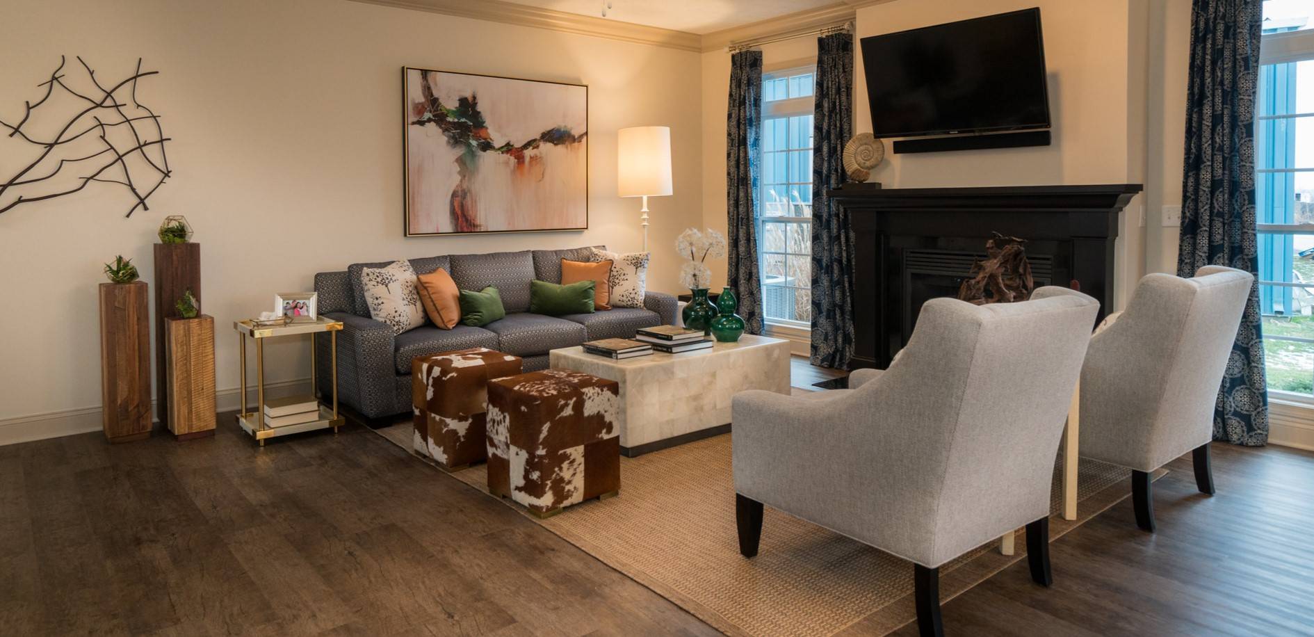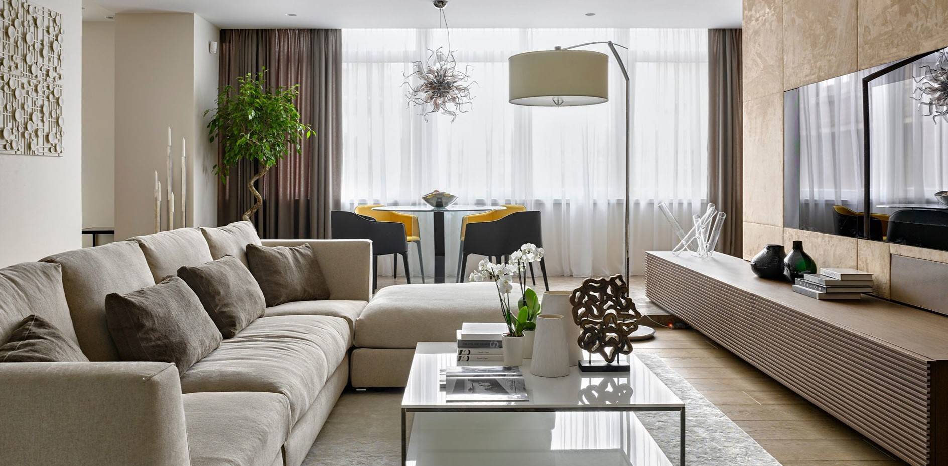 Светлая плитка в интерьере гостиной визуально не отличается от деревянного покрытия.