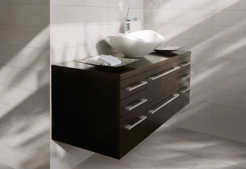 Деревянная тумба в ванной будет хорошо сочетаться с каменной отделкой