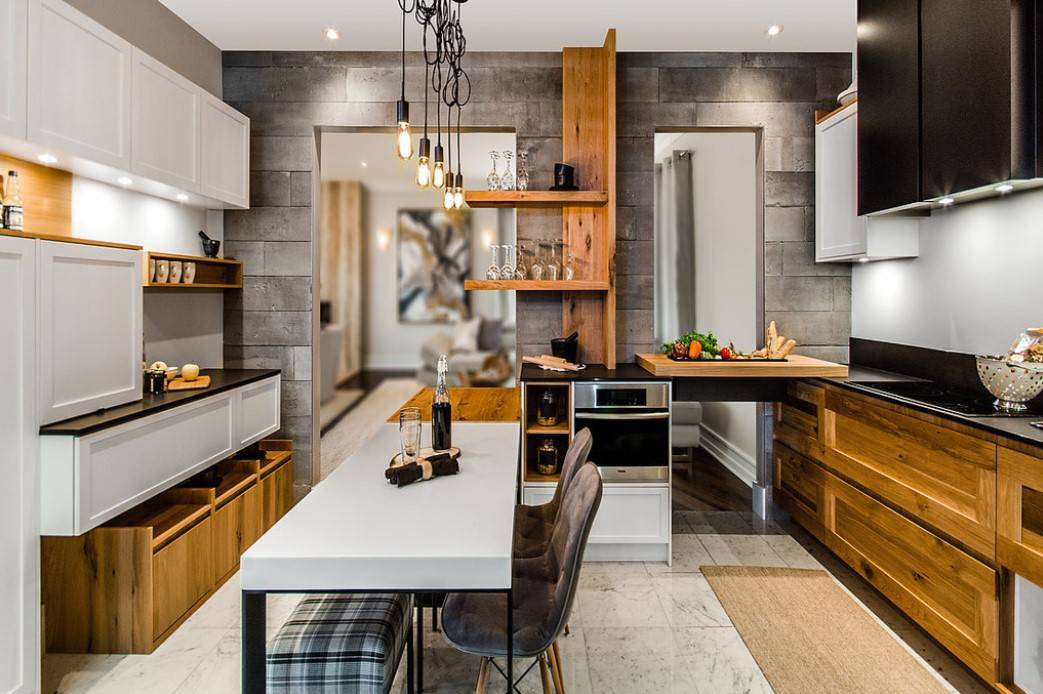 Каменный фартук гармонирует с деревянной декоративной балкой